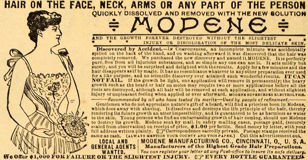 This is a small original 1892 black and white print ad for the Modene Hair Removal bottle from Modene Manufacturing Company located in Cincinnati, Ohio.