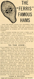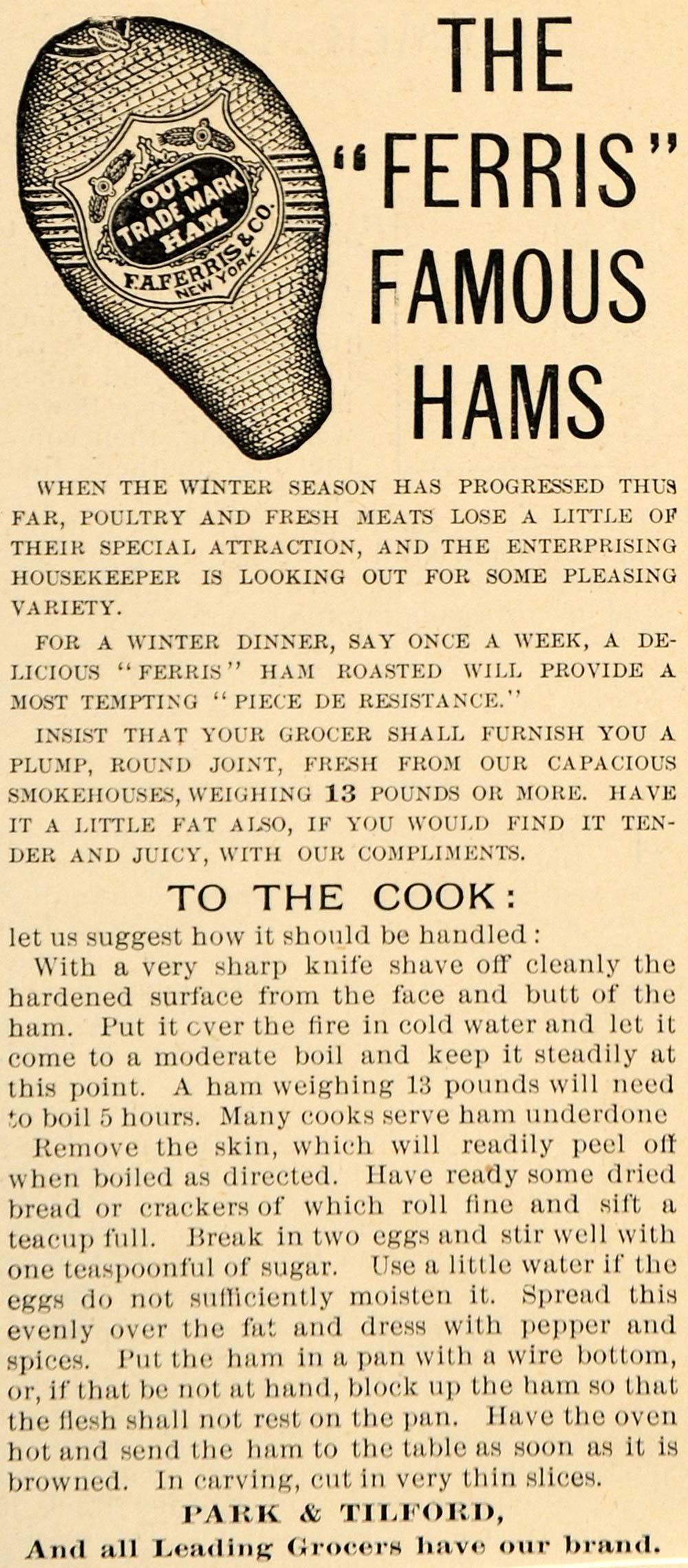 This is an original 1892 black and white print ad for the Ferris Famous Hams from Park & Tilford.