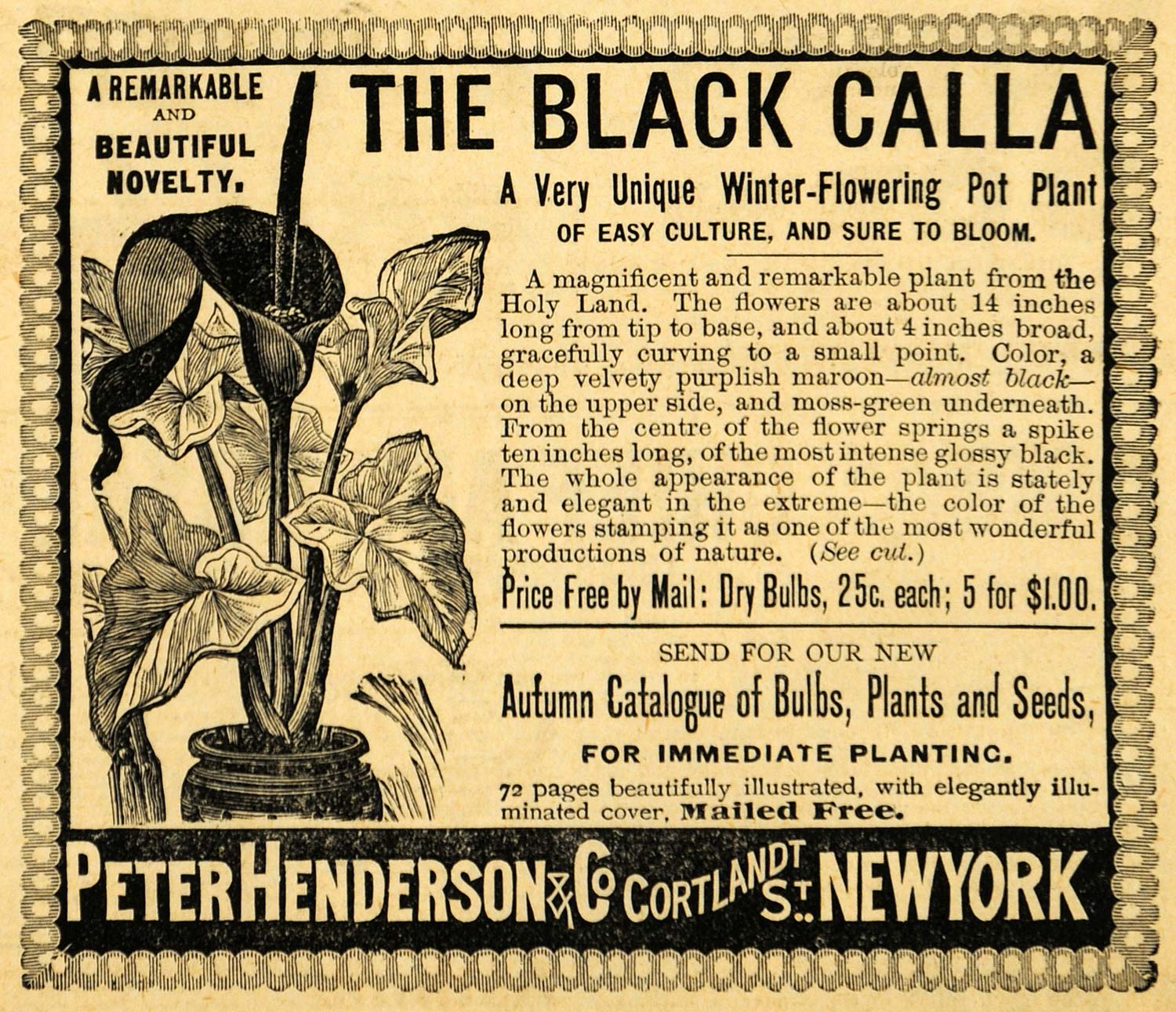 This is an original 1892 black and white print ad for Peter Henderson & Company of Cortlandt Street in New York. This ad is for the company's Black Calla winter-flowering potted plants.