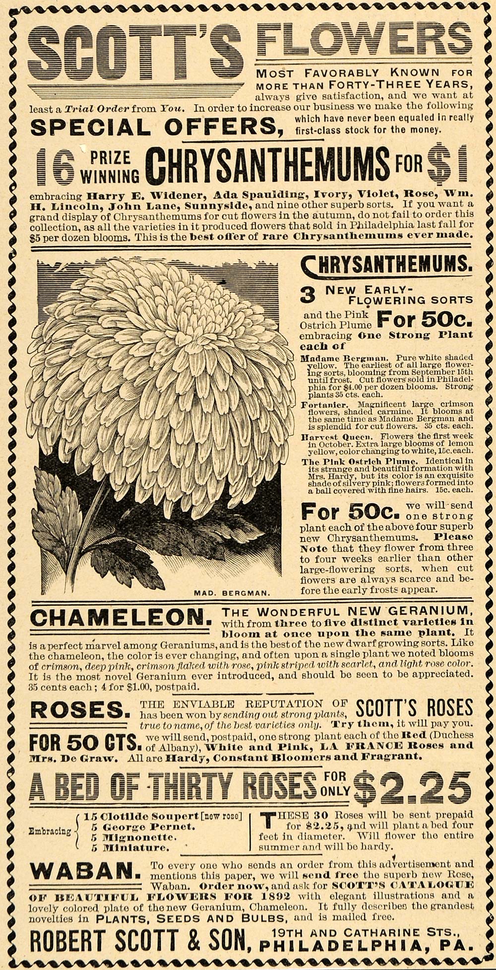 This is an original 1892 black and white print ad for the Chrysanthemum also known as Mums or Chrysanths flowers from Robert Scott & Son located at 19th and Catharine Streets, Philadelphia, Pennsylvania.