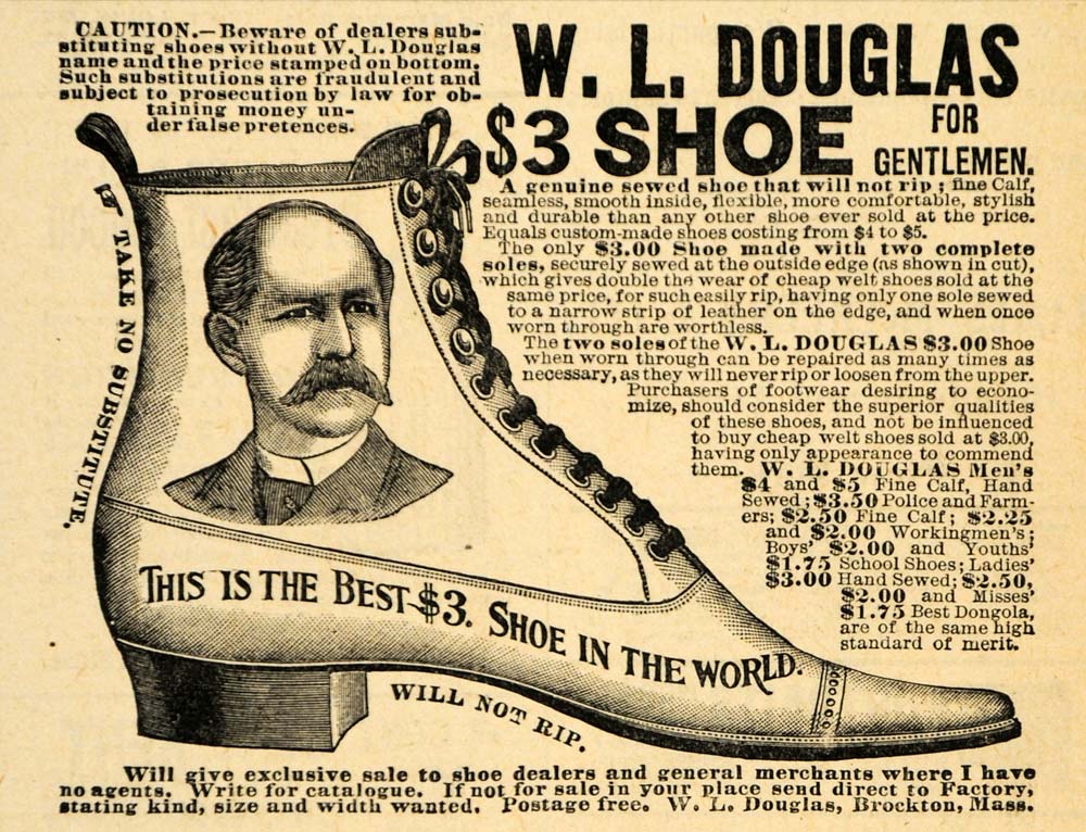 This is an original 1892 black and white print ad for W. L. Douglas of Brockton, Massachusetts. This ad features their W. L. Douglas shoes for gentlemen.