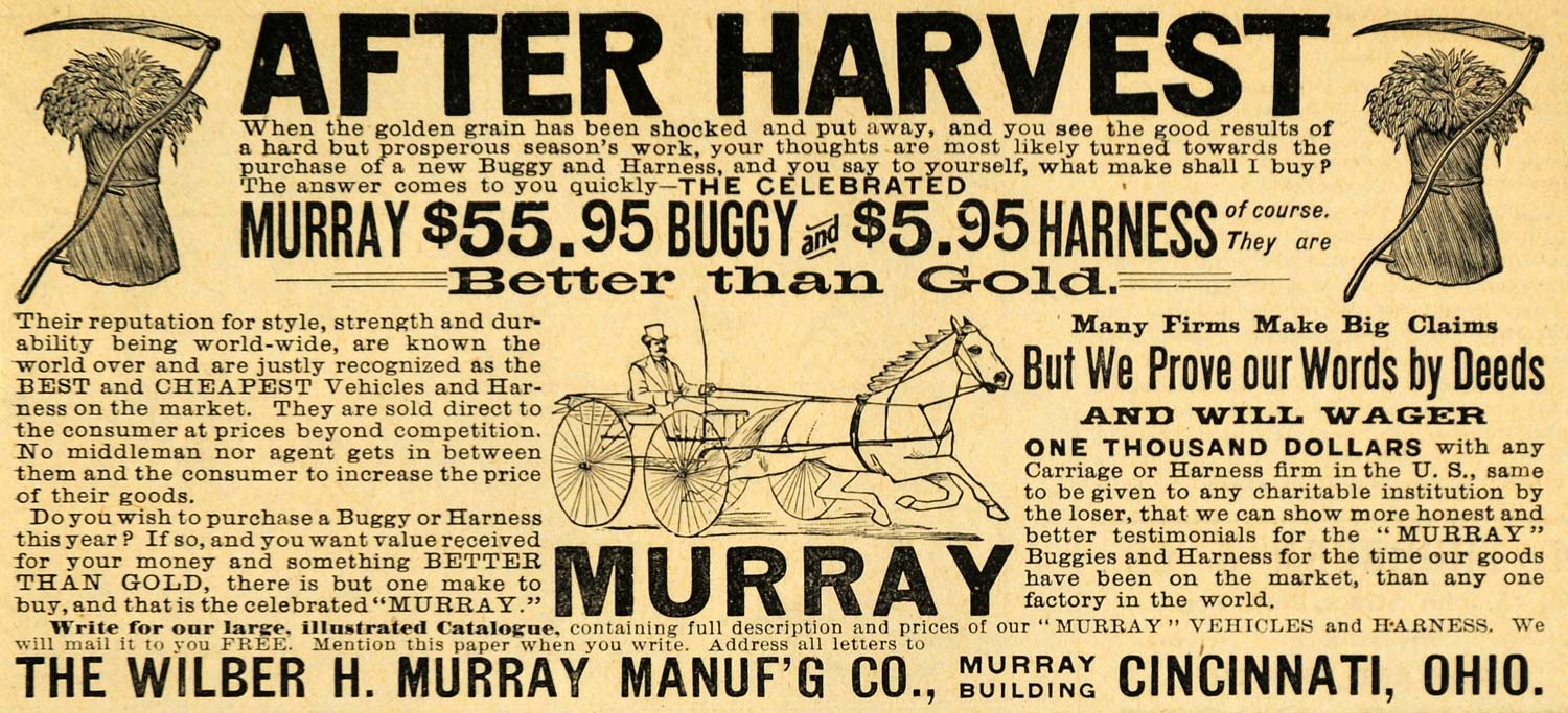 Keywords specific to this image: Antique Advertising, Harvest, Hay, Scythe, Pricing, Alternative Transportation, Farm Equipment, Agricultural Machinery, Agriculture, Equine