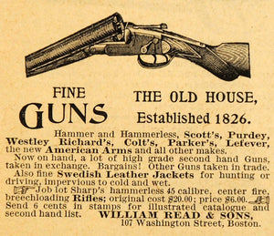 This is a small original 1892 black and white print ad for William Read & Sons of 107 Washington Street in Boston, featuring their fine firearms and guns, including the following models: Scott's, Purdey, Westley Richard's, Colt's, Paker's, Lefever, and American Arms.