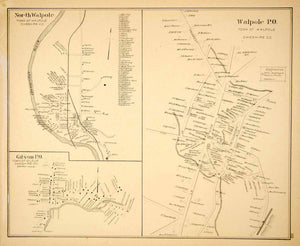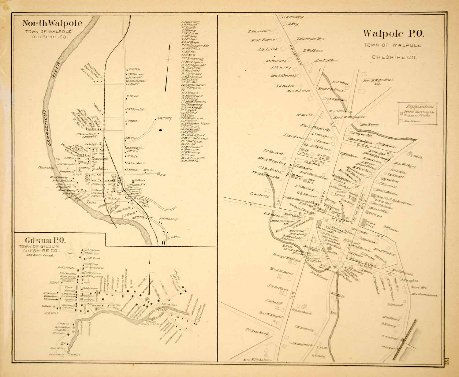 This is an original 1892 monochrome lithographed map of the New England towns of Walpole and Gilsum and the village of North Walpole in Cheshire County, New Hampshire. The map also depicts a portion of the Connecticut River.