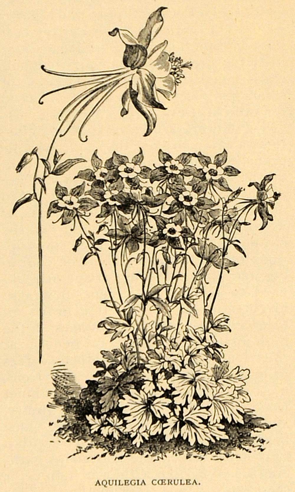 This is an original 1892 halftone print of the Aquilegia Caerulea flowers, native to the Rocky Mountains. Most of these are called Colorado Blue Columbine or Rocky Mountain Columbine.