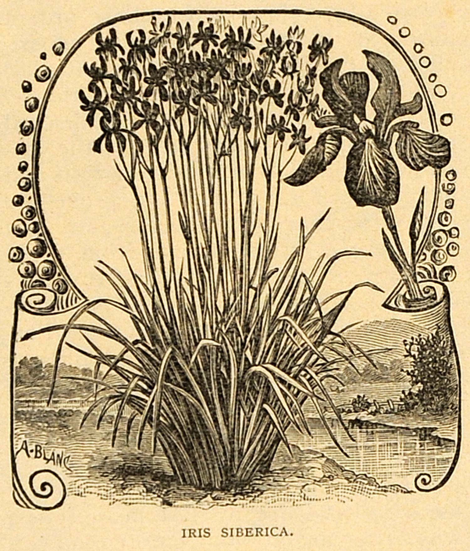 This is an original 1892 halftone print of the Iris Sibirica flowers, native to northern Asia, eastern and central Europe.