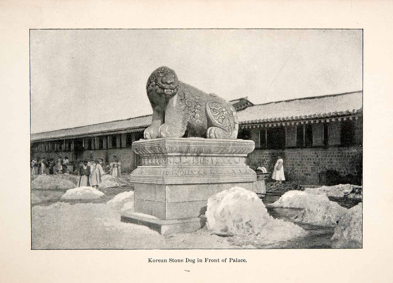 This is an original 1892 black and white halftone print of a stone dog sculpture in front of a palace in Seoul, Korea.