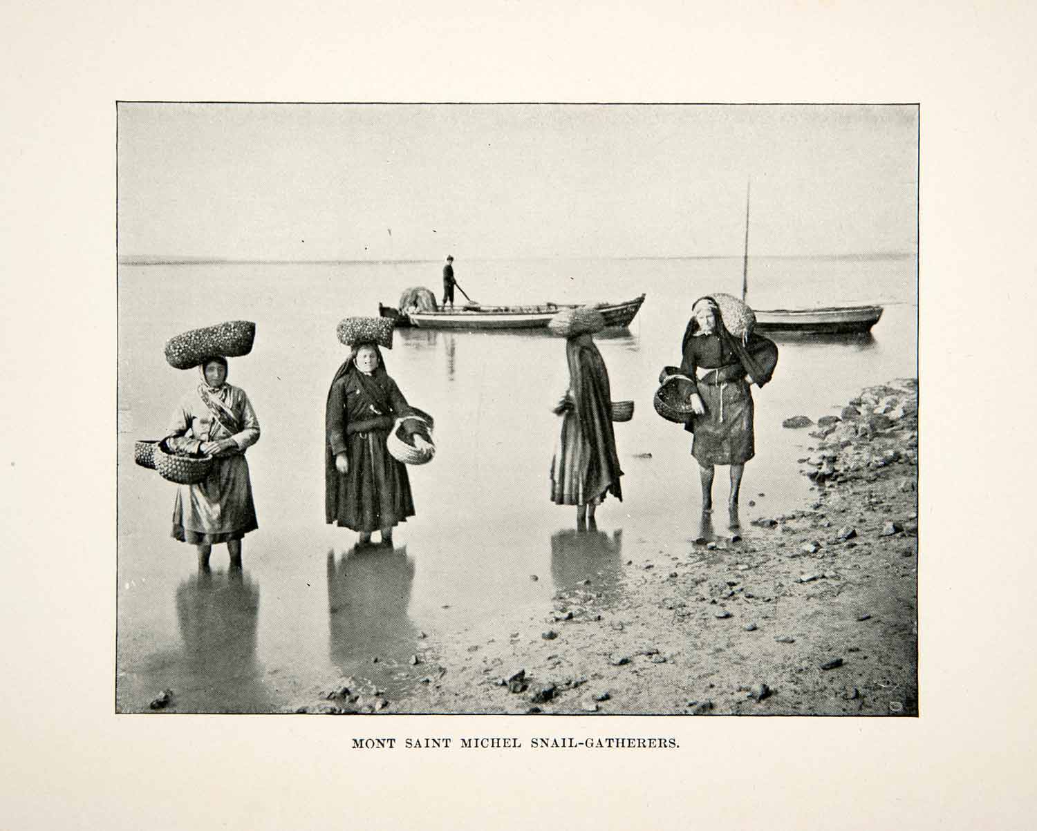 This is an original 1892 black and white halftone print of women of Mont Saint Michel gathering snails.