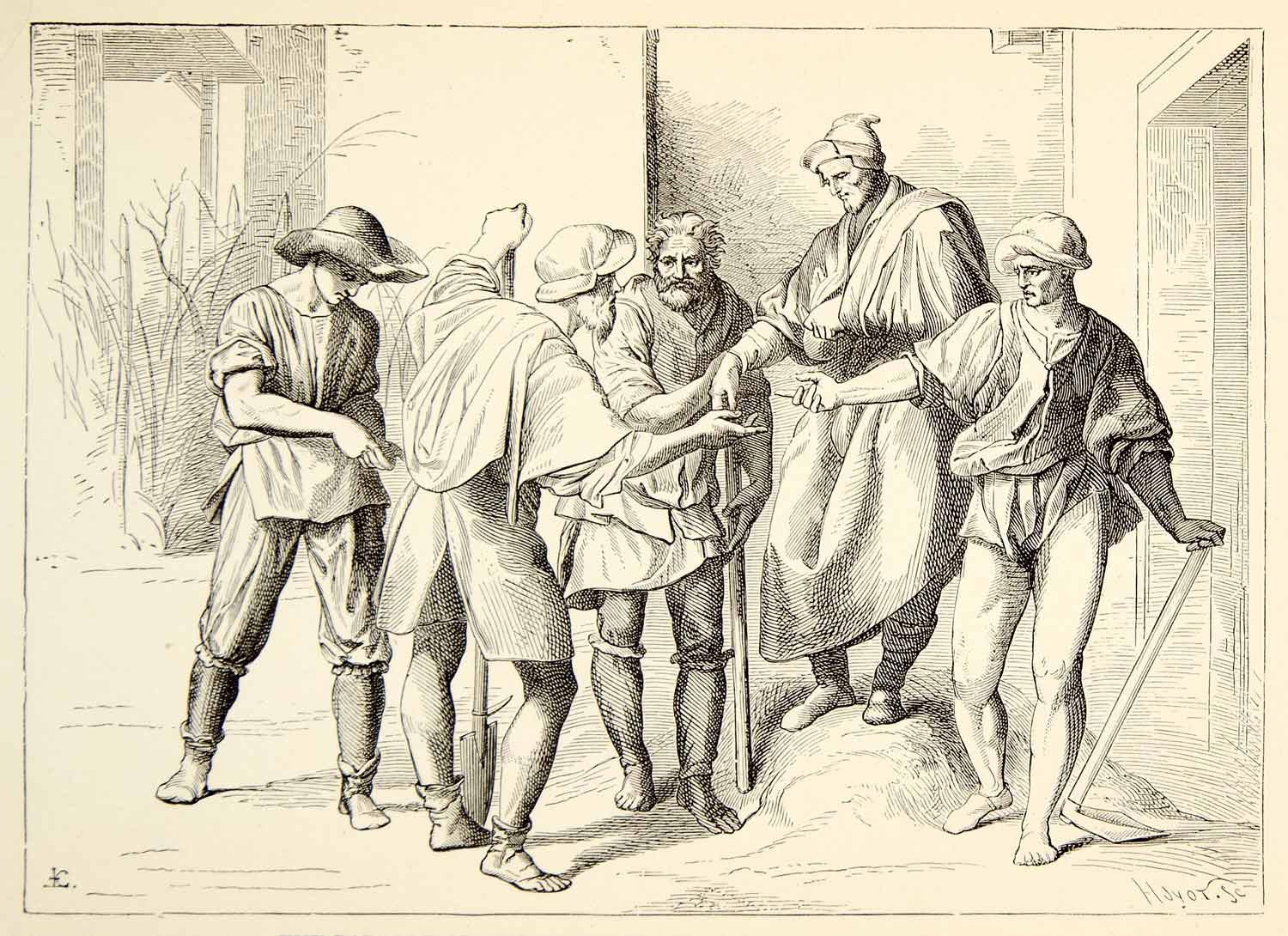 This is an original 1892 black and white wood engraving that depicts the Parable of the Vineyard, after Italian Renaissance artist Andrea del Sarto.