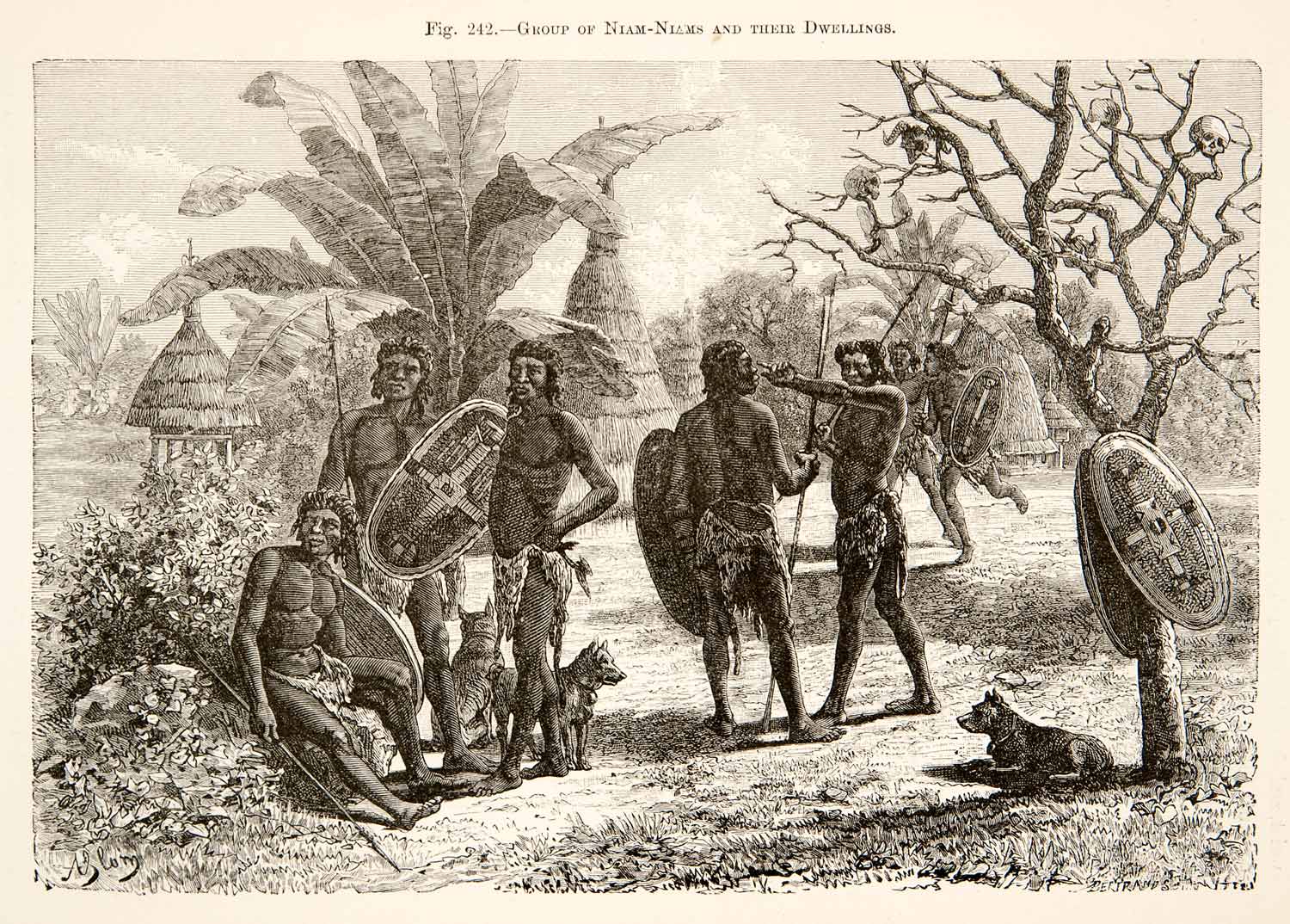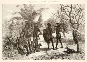 Keywords specific to this image: village, shields, spears, indigenous, skull tree
