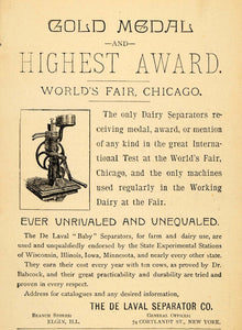 This is an original 1893 black and white print ad for De Laval "Baby" Separators for farm and dairy from The De Laval Separator Co., 74 Cortlandt St., NYC, the only dairy separators receiving the gold medal and highest award at the Chicago World's Fair.