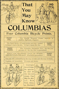 Albert Augustus Pope, of the Pope Manufacturing Company, founded the Columbia Cycle Company in Hartford, Connecticut. Pope gained a great fortune early on by purchasing Pierre LallementÕs original bicycle patent. Thereafter, Pope actively and aggressively pursued the rights to as many bicycle patents as possible, thus limiting other American bicycle manufacturerÕs abilities to make a profit. Pope also invented ball bearings in all moving parts of the bicycles, as well as hollow steel tubes used in the cycleÕs frame. He invested much of his time in promoting the bicycle industry, through clubs, races and more. In 1878, the company introduced the Columbia High Wheeler bicycle. Until 1896, The Pope Manufacturing Company was the leader amongst United States bicycle producers.