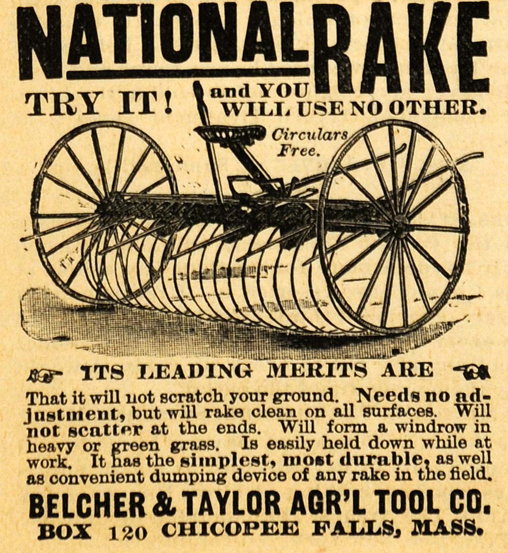 This is a small original 1893 black and white print ad for the Belcher & Taylor Agricultural Tool Company, located at Box 20 in Chicopee Falls, Massachusetts. This ad features their National Rake for working farmland.