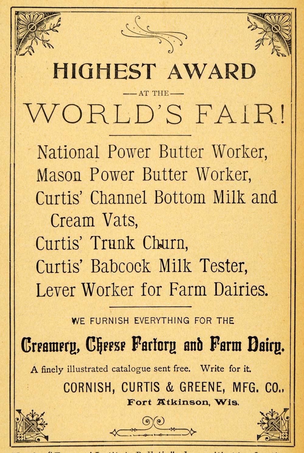 This is an original 1893 black and white print ad for the Cornish, Curtis & Greene Mfg. Co. of Fort Atkinson, Wisconsin.