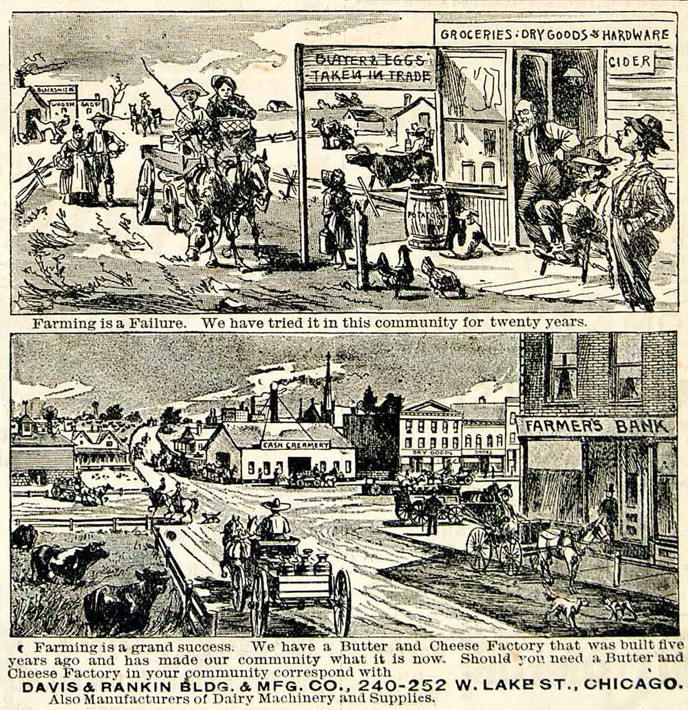 Keywords specific to this image: Antique Advertising, Farming, Farmer, Agriculture, Agrarian, Factory, Street, Town, Wagon, Horse, Donkey, Chicken, Dog, Barrel, Crop, Community, Building, Manufacturing Company, Cattle, Pasture, Field, Creamery, Bank, Carriage, Buggy, Machinery, Equipment, Supplies, Groceries, Dry Goods, Hardware, General Store, Child, Girl, Rural, Eggs, 252, West, Street, Illinois