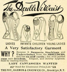 This is a small original 1893 black and white print ad for the Double Ve Waist corsets by The Foy, Harmon and Chadwick Company in Brooklyn, New York.