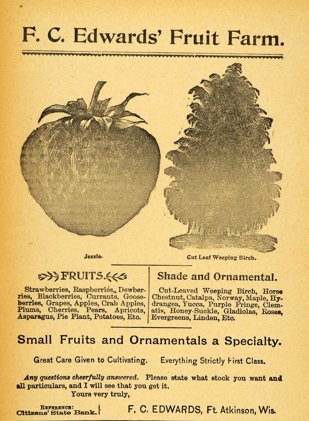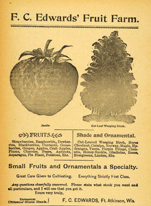 This is an original 1893 black and white print ad for F. C. Edwards' Fruit Farm in Fort Atkinson, Wisconsin.