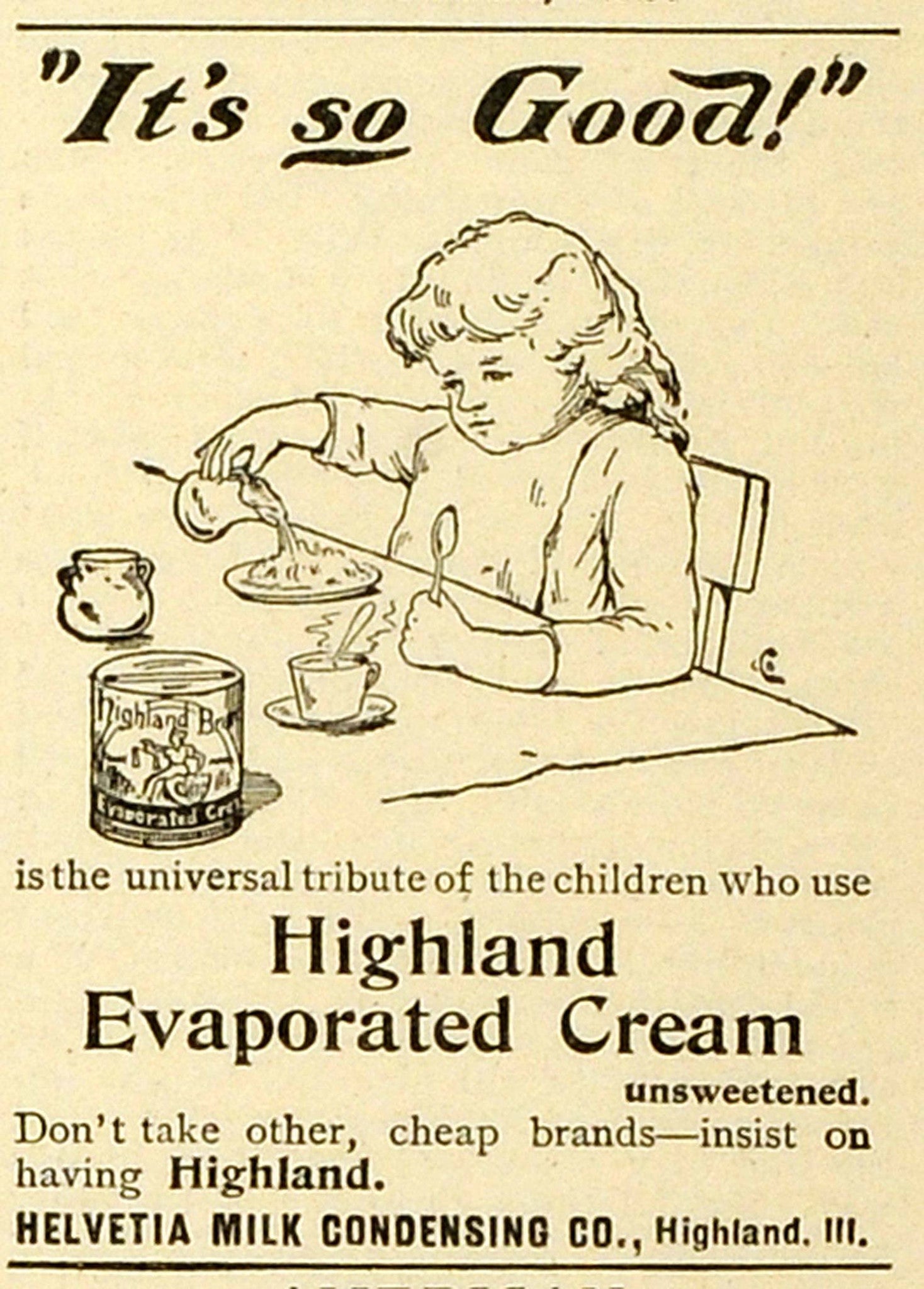 This is a small original 1893 black and white print ad for Highland Evaporated Cream from Helvetia Milk Condensing Company located in Highland, Illinois.
