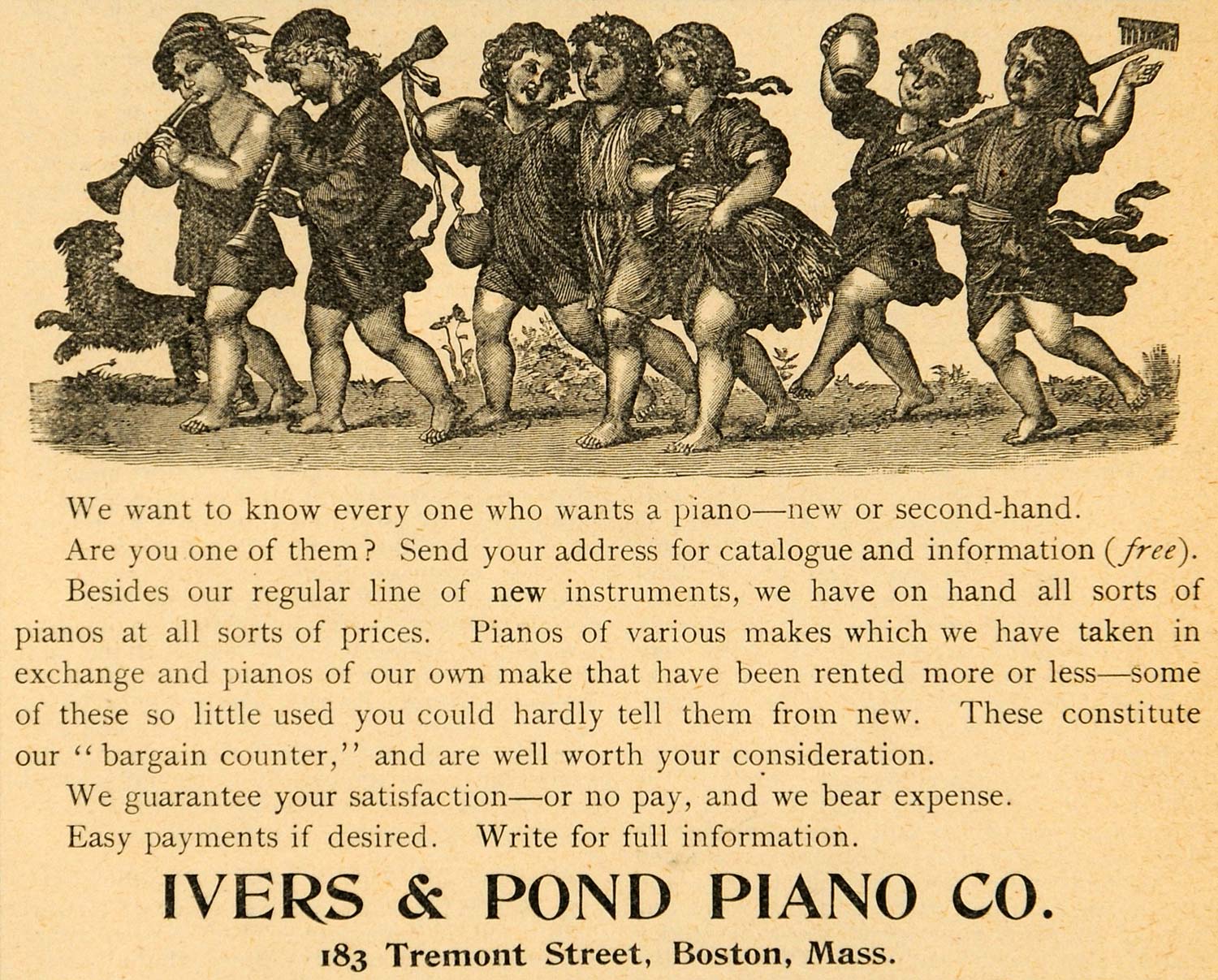 This is an original 1893 black and white print ad for the Ivers & Ponds Piano Company located at 183 Tremont Street, Boston, Massachusetts.
