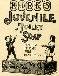 This is a small original 1893 black and white print ad for the Kirk's Juvenile Toilet Soap from Jas. S. Kirk and Company located in Chicago, Illinois.