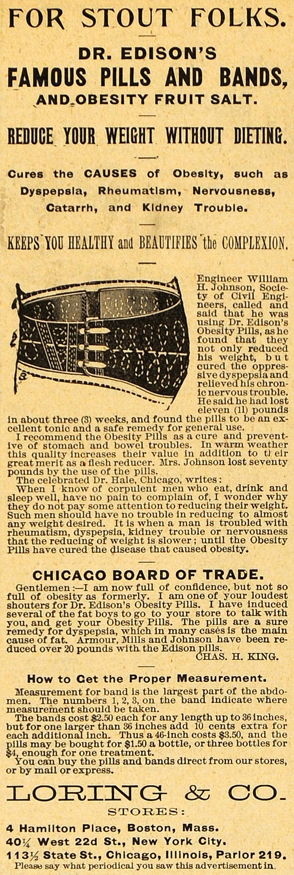 This is a small original 1893 black and white print ad promoting Dr. Edison's Pills and Bands treating obesity from Loring and Company located at 4 Hamilton Place, Boston, Massachusetts.