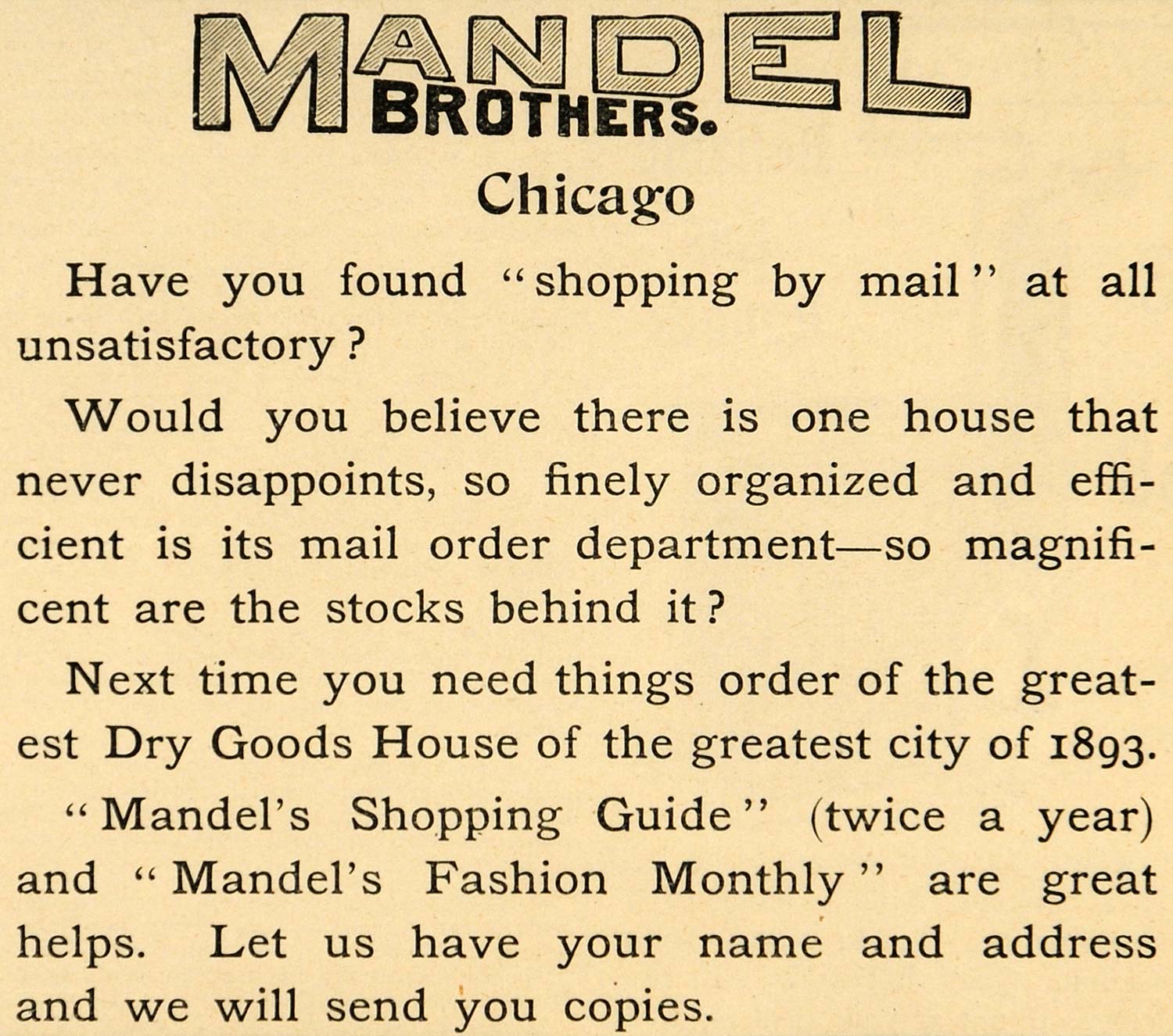 This is an original 1893 black and white print ad for the Mandel Brothers Department Stores located in Chicago, Illinois.