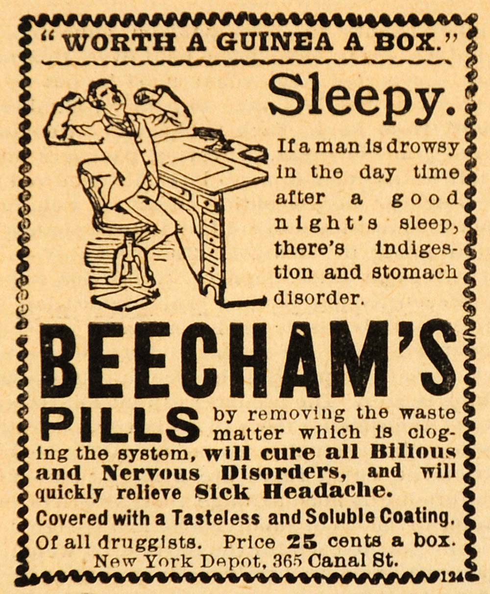 Keywords specific to this image: Antique Advertising, Drugs, Pharmaceutical, Pharmacy, Druggist, Nerves, Fatigue, Remedy, Cure, Treatment, Medicine, Drowsiness, 365 Canal Street New York, Gas