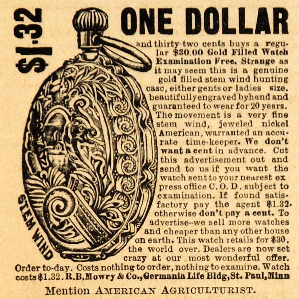 This is a small original 1893 black and white print ad for R. B. Mowry & Company, located in the Germania Life Building in St. Paul, Minnesota. This ad features a Stem Wind Pocket Watch that is gold filled.