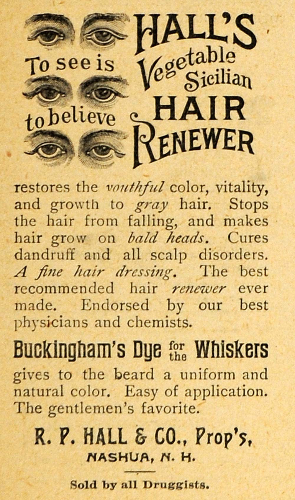This is a small original 1893 black and white print ad for the Hall's Vegetable Sicilian Hair Renewer from R. P. Hall & Company located in Nashua, New Hampshire.