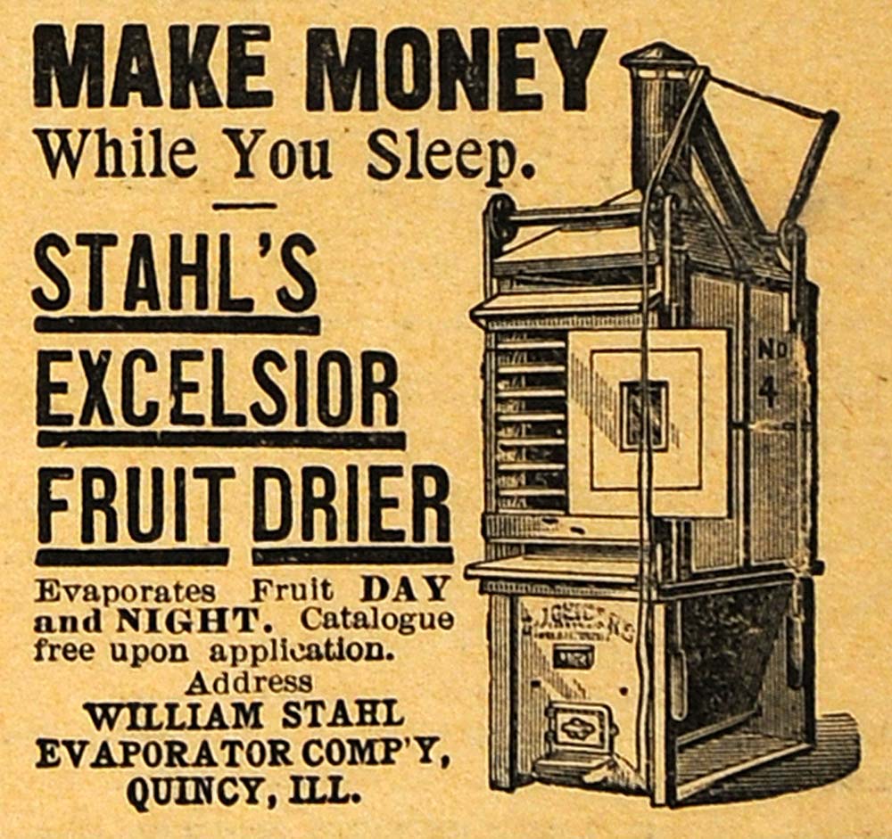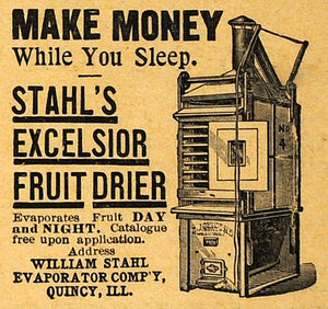 This is an original 1893 black and white print ad for Stahl's Excelsior Fruit Dryer, a product by William Stahl Evaporator Company, located in Quincy, Illinois.