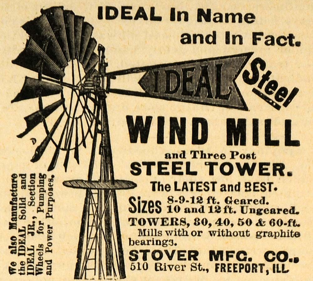This is a small original 1893 black and white print ad for the Stover Manufacturing Company of 510 River Street in Freeport, Illinois. This ad features their Ideal Steel Wind Mills, equipped with Three Post Steel Towers.