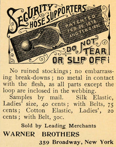 This is a small original 1893 black and white print ad for the Security Hose Supporters from Warner Brothers located at 359 Broadway, New York.