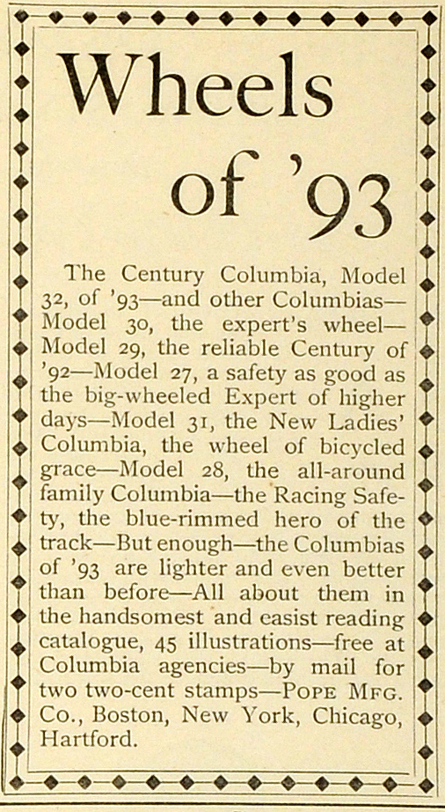 1893 Ad Wheels of '93 Century Columbia Tire Bicycle Model 32 Pope MX7