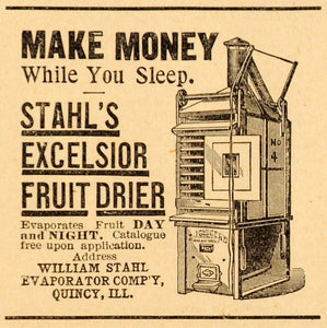 This is a small original 1893 black and white print ad for the William Stahl Evaporator Company of Quincy, Illinois. This ad features their Stahl's Excelsior Fruit Drier that works day and night.