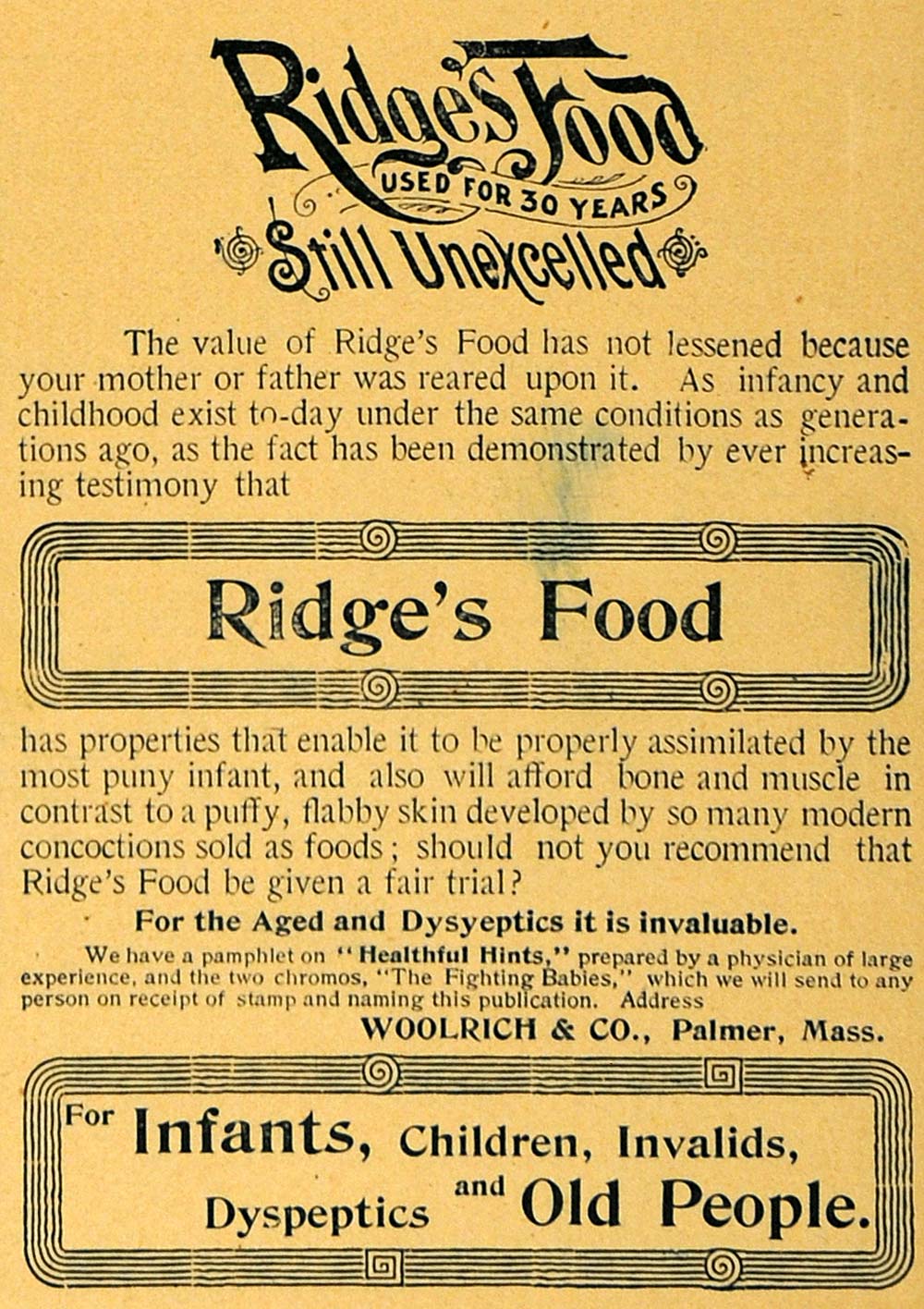 This is an original 1893 color print ad for the Ridge's Food for infants from Woolrich & Company located in Palmer, Massachusetts.
