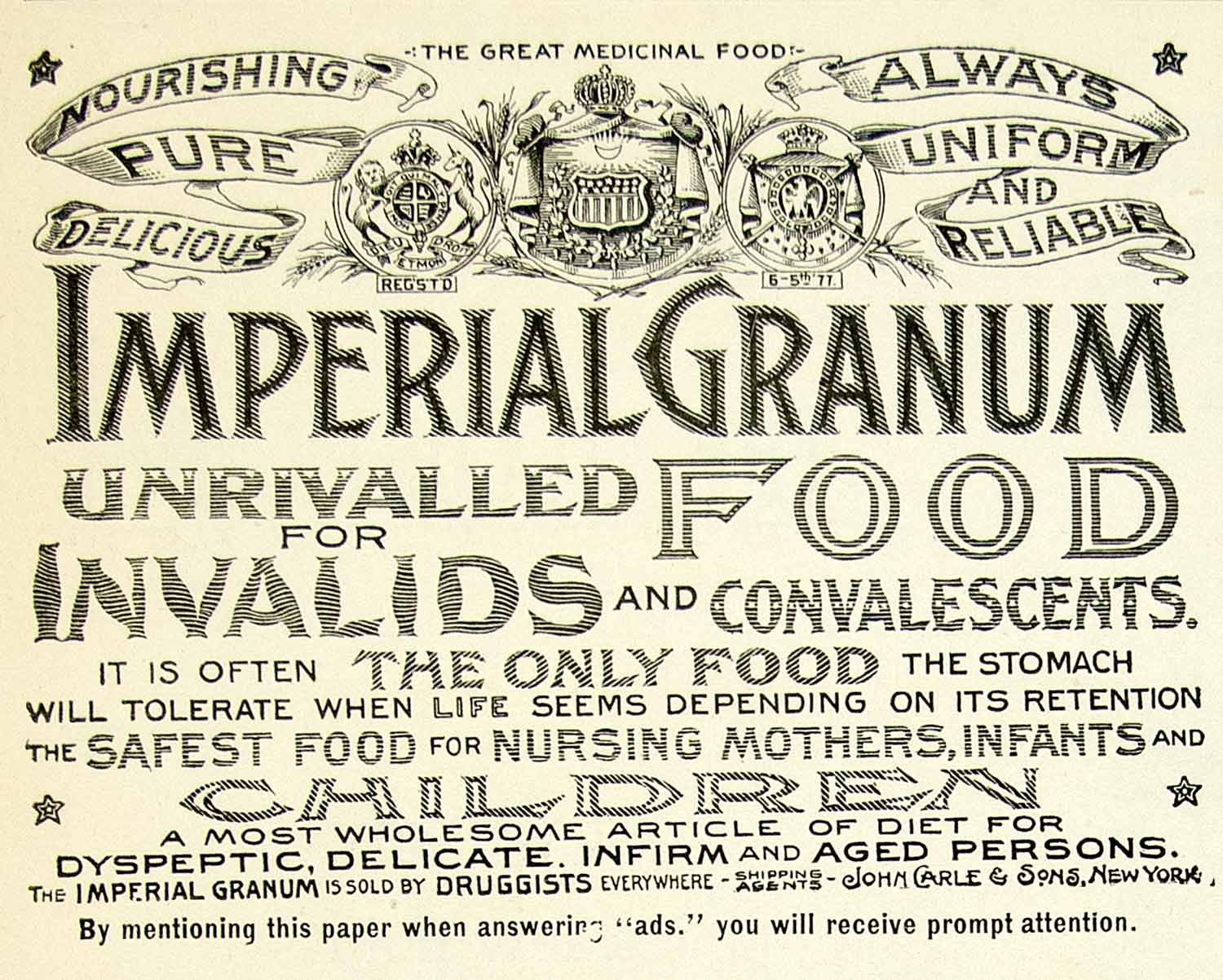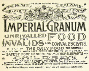 This is an original 1893 black and white print ad for Imperial Granum, an easy food perfect for children and nursing mothers.