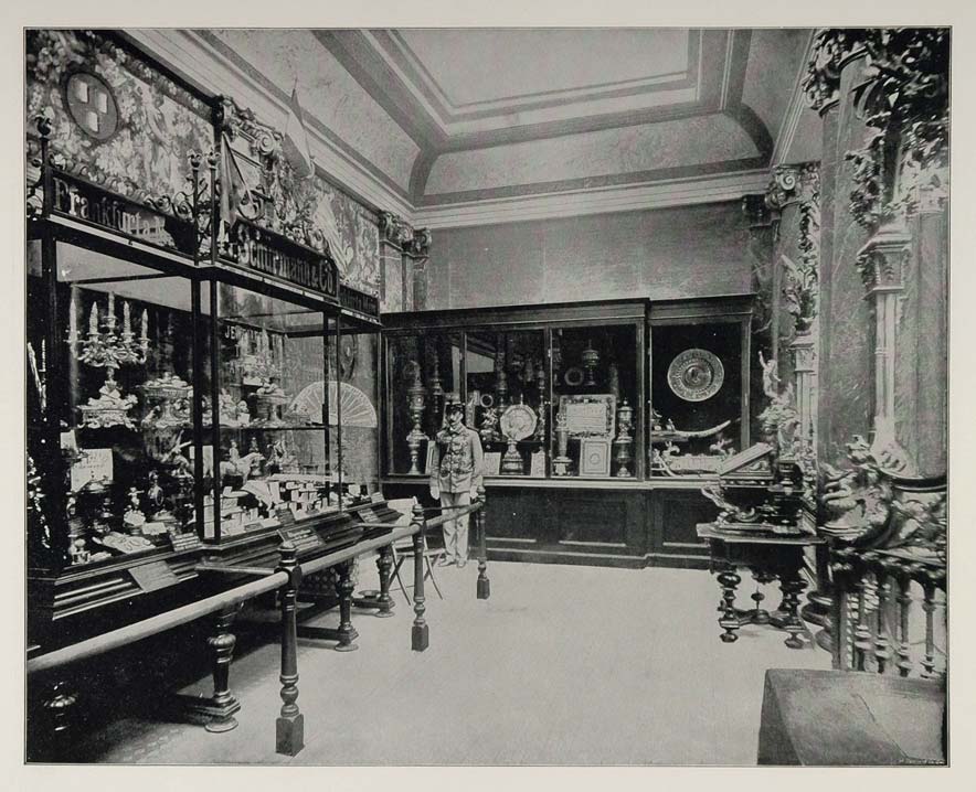 This is an original 1893 halftone print of the cases in the German Section of the Manufactures Building at the 1893 Chicago World's Fair which held trophies, souvenirs, and gifts offered to Bismarck, the former "Iron" Chancellor of Germany. A Columbian Guard stands on watch in the background. (Please note that, typical of halftone prints, there is printing on the reverse.)