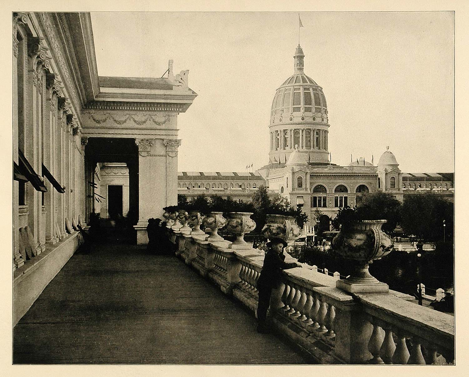 This is an original 1893 halftone print of the eastern veranda of the Woman's Building at the 1893 Chicago Worlds Fair. The capitol building of Illinois can be seen from this veranda. (Please note that, typical of halftone prints, there is printing on the reverse.)