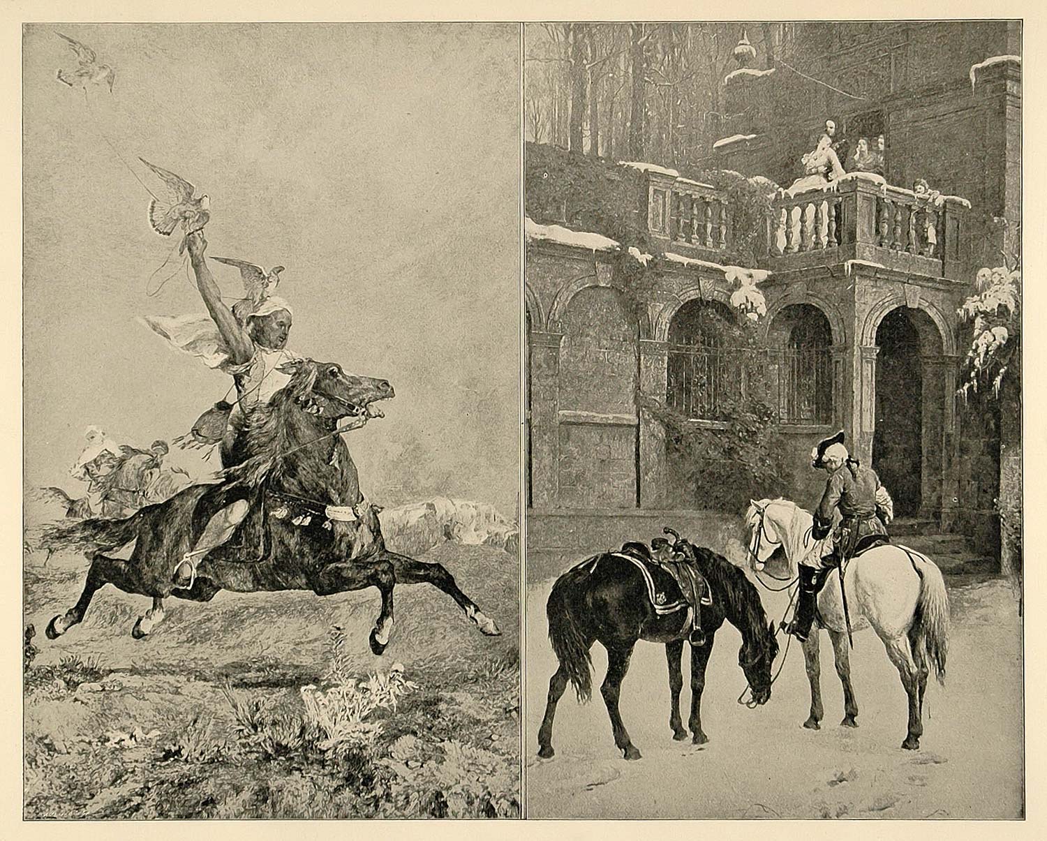 This is an original 1893 halftone print of two paintings in the Art Palace at the 1893 Chicago Worlds Fair. "The Falconer" was by Eugene Fromentin and "The Empty Saddle" was painted by S. E. Waller, of London. (Please note that, typical of halftone prints, there is printing on the reverse.)