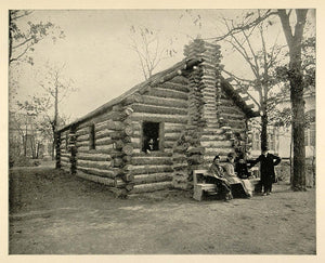 This is an original 1893 halftone print of the Hunter's Cabin at the 1893 Chicago Worlds Fair. It was located at the south end of the Wooded Island and was a log house with a clay floor and a stick chimney. It was built by Theodore Roosevelt, of New York, a lover of huntsman's sports, as a museum and memorial in honor of Daniel Boone and Davy Crockett. (Please note that, typical of halftone prints, there is printing on the reverse.)