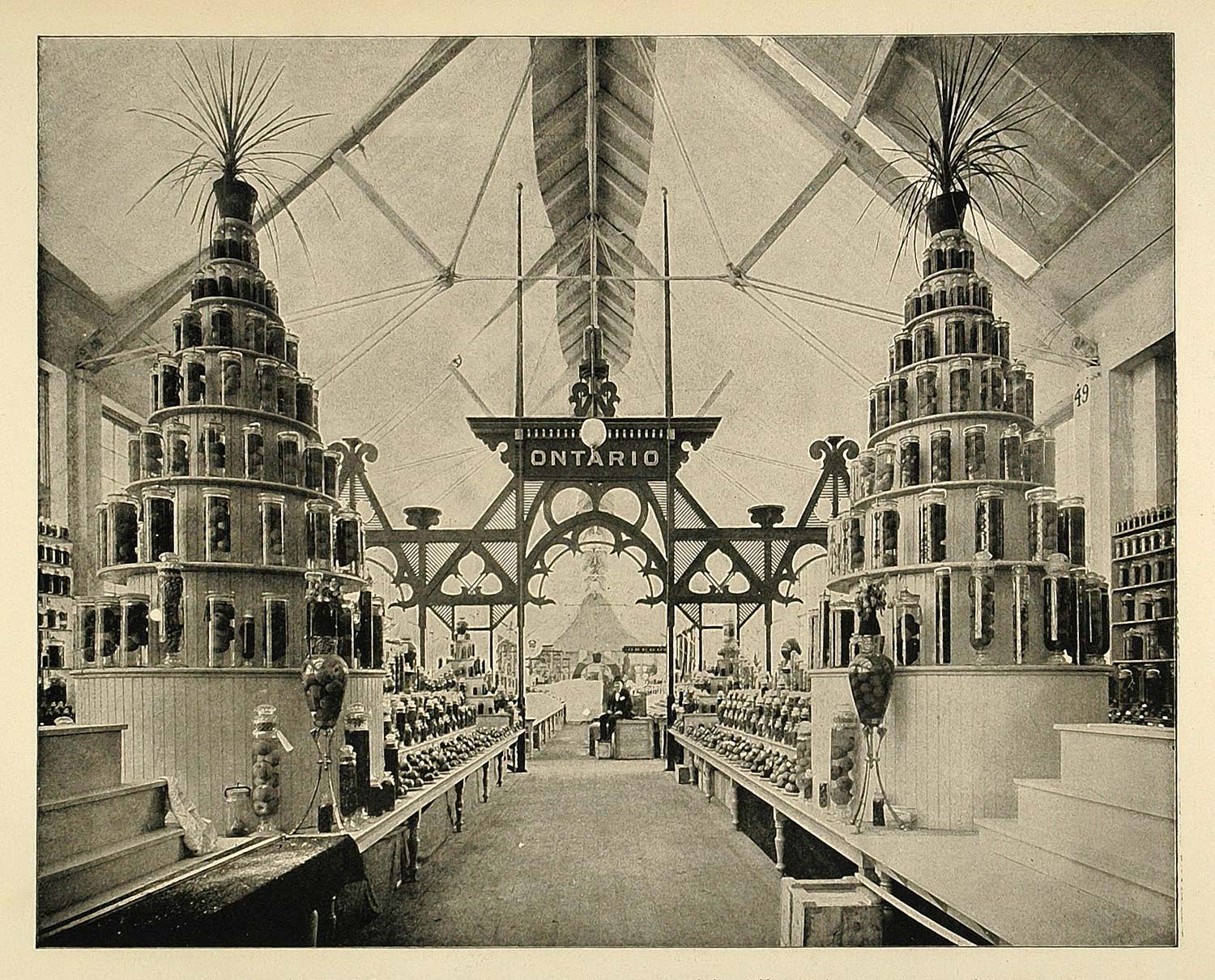 This is an original 1893 halftone print of the Ontario display in the Horticultural Building at the 1893 Chicago Worlds Fair. In this display, the people of Canada, offered an exhibition of the variety of fruits (apples, pears, grapes, berries, oranges, lemons, limes, peaches, plums, cherries, and currants) grown in the province of Ontario. (Please note that, typical of halftone prints, there is printing on the reverse.)