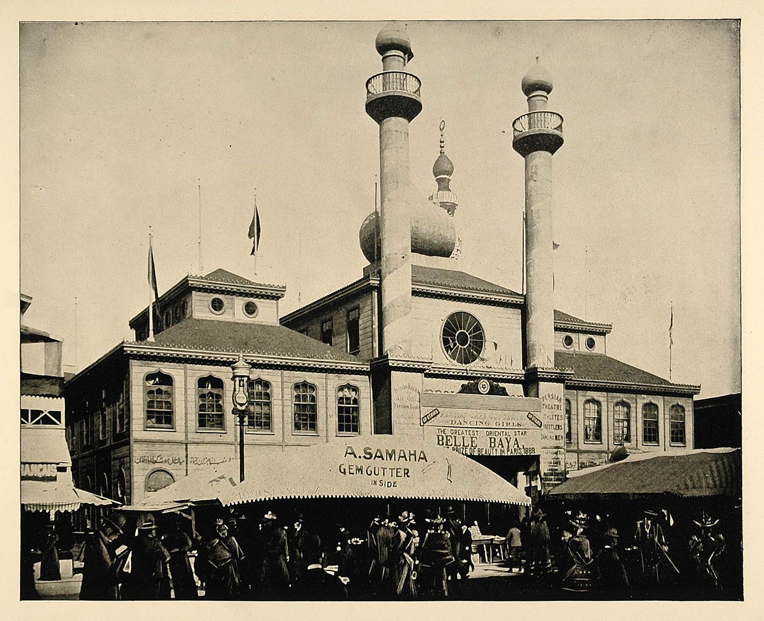 This is an original 1893 halftone print of the Persian Palace at the 1893 Chicago Worlds Fair. The Persian people hoped to attract Americans by setting up their shops, where the weaving of carpets, rugs and shawls, the engraving of metals, the labor of lapidaries, and the manufacture of Persian candies might be seen. (Please note that, typical of halftone prints, there is printing on the reverse.)