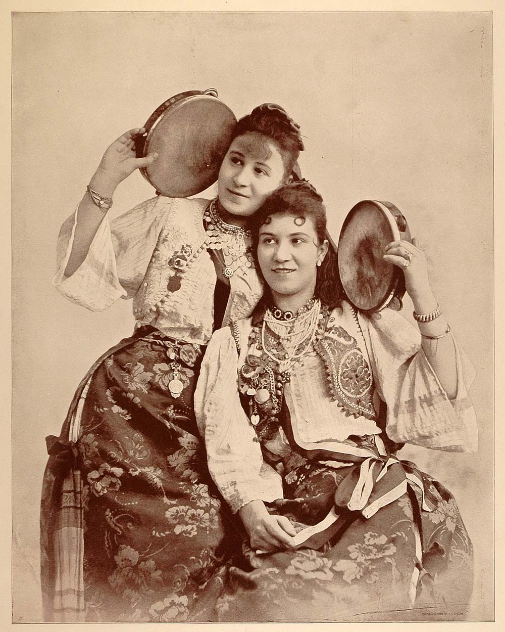 This is an original 1894 halftone print portrait of the Farbianu Sisters from Romania with their tambourines and festive costumes.