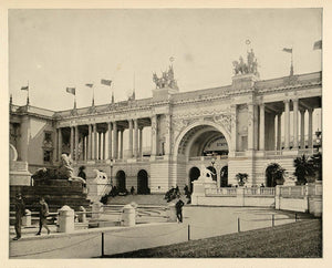 This is an original 1893 halftone print of the Southern Colonnade at the 1893 Chicago Worlds Fair. The architect of the Colonnade was C. B. Atwood, of Chicago. The chariot groups on top of the building and the lion below were by M. A. Waagen. (Please note that, typical of halftone prints, there is printing on the reverse.)