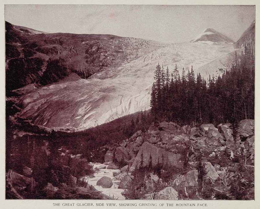 This is an original 1893 duotone print of the Great Glacier in the Selkirk Mountains. Please note that there is printing on the reverse.