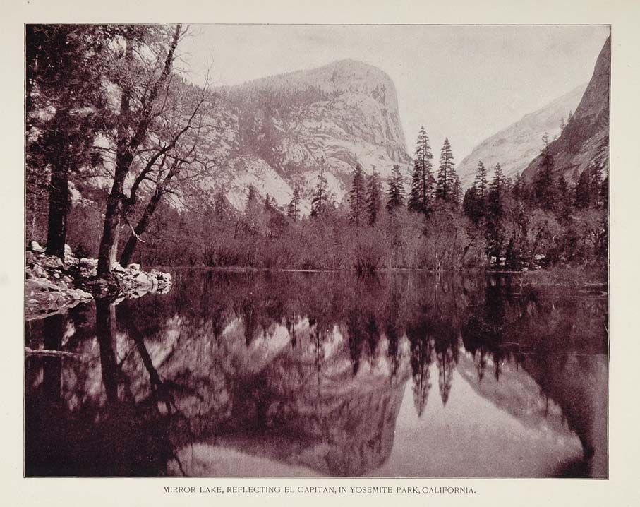 This is a lovely, original 1893 duotone print of Mirror Lake in Yosemite National Park, California.