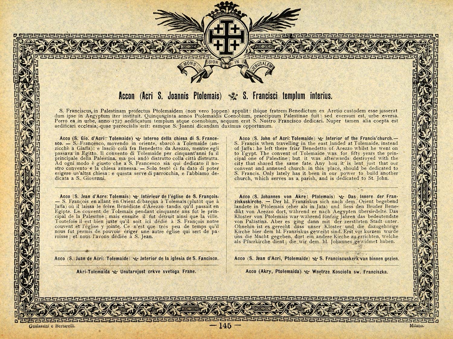 Period Paper is pleased to offer an extraordinary and rare collection of original etchings of the Holy Land of Judea and Galilee. Created to document the history of the Franciscan missions in the Holy Land, these etchings provide an excellent historic visual record of the landscape, architecture, and people of Palestine and the Middle East. Each individually hand-painted etching (from a photograph) is mounted on a thick fiber board with a stunning decorative design lithographed in rich gold gilt. These museum-quality etchings are impossible to find anywhere.