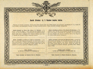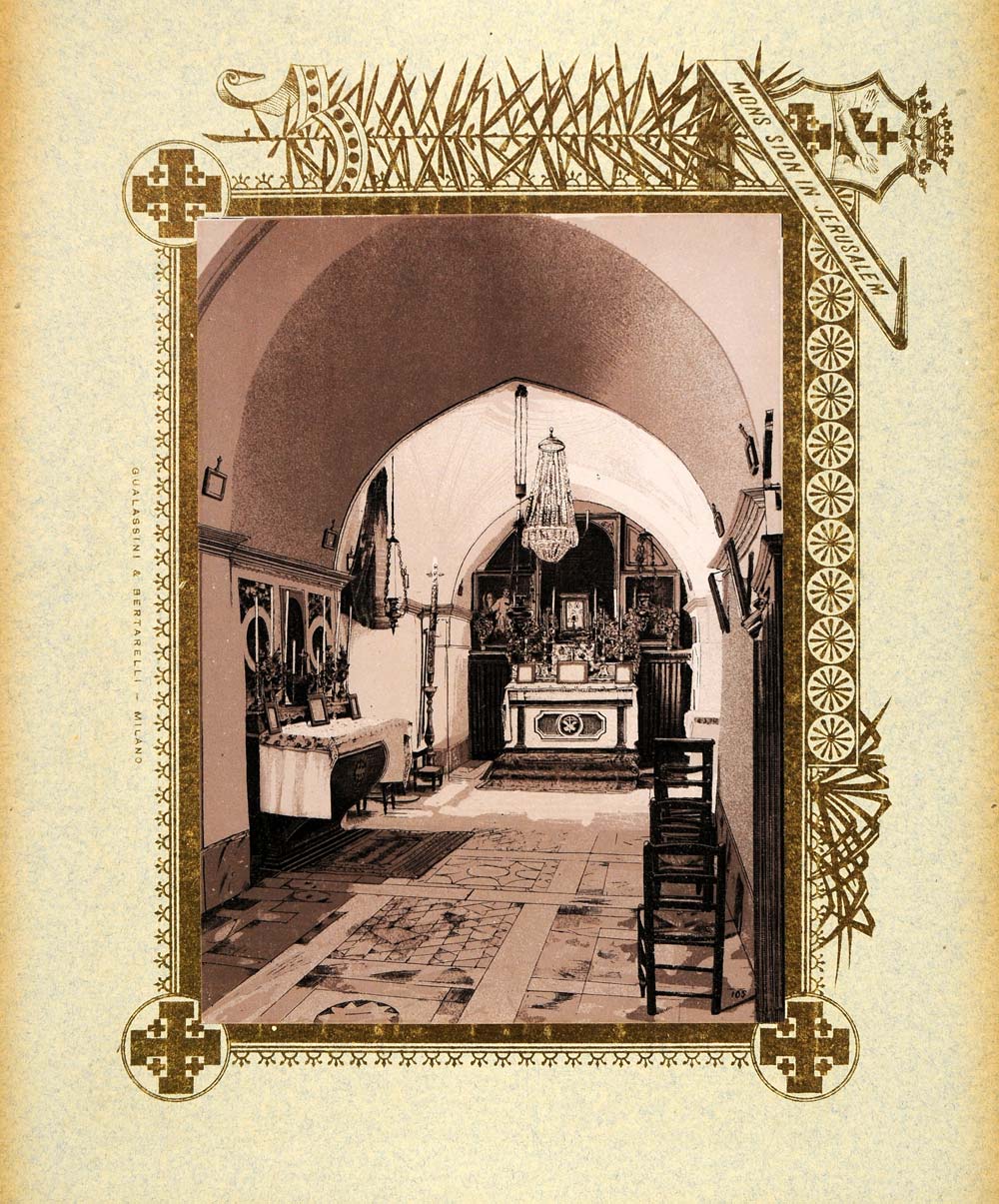 This is an original 1893 etching (individually hand-painted) of the interior of the Church of St. Nicodemus in the town of Ramleh or Arimathea, said to be the home of Joseph of Arimathea, who with Nicodemus prepared the body of Jesus for burial.