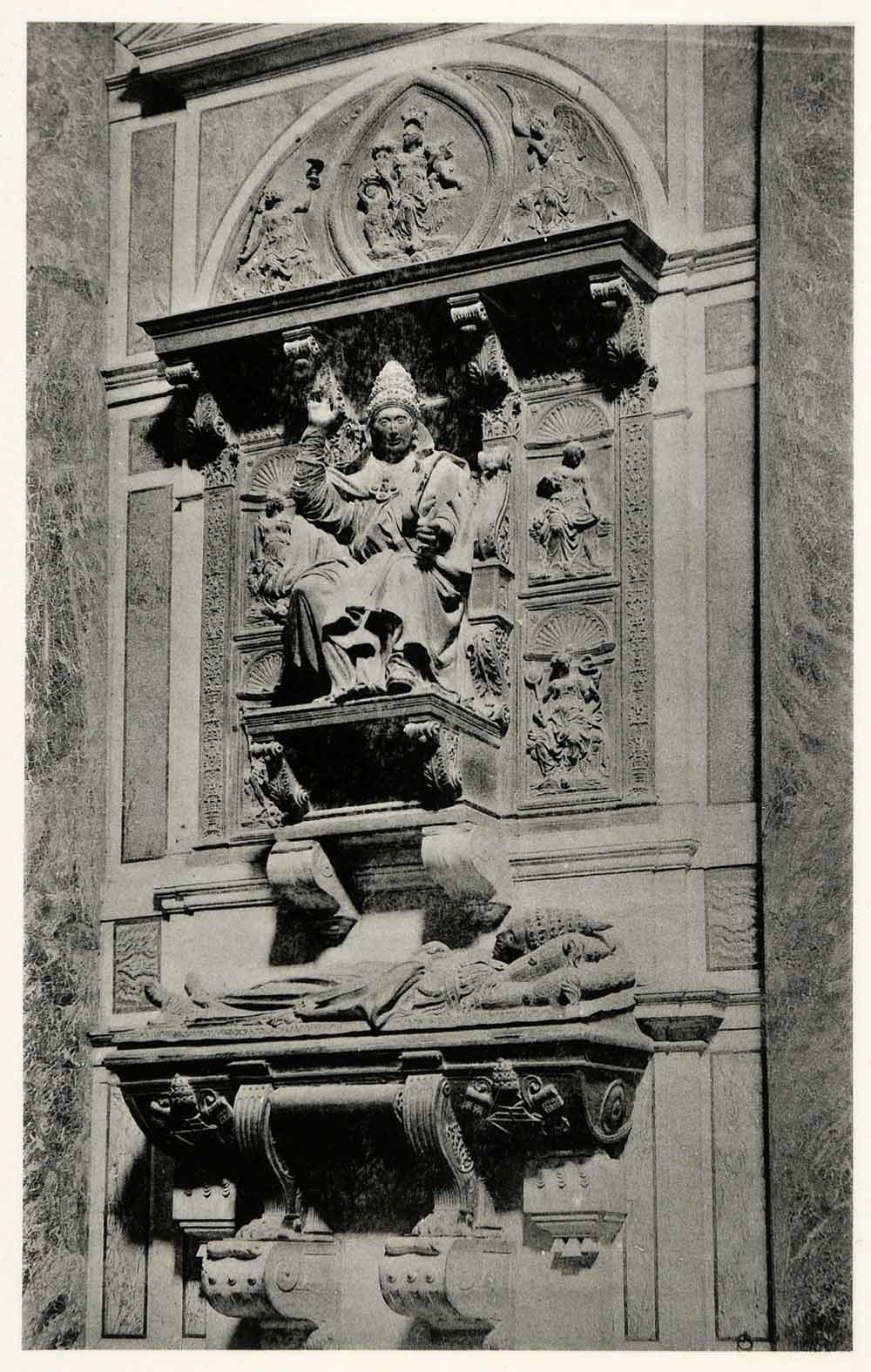 This is an original 1893 black and white heliogravure of the tomb of Pope Innocent VIII. Sculpted by Antonio del Pollaiolo, it was the first tomb to include a sculpture of a "live" pope.