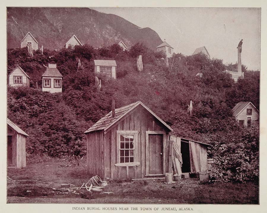 This is an original 1893 duotone print of Indian burial houses near Juneau, Alaska. Please note that there is printing on the reverse.